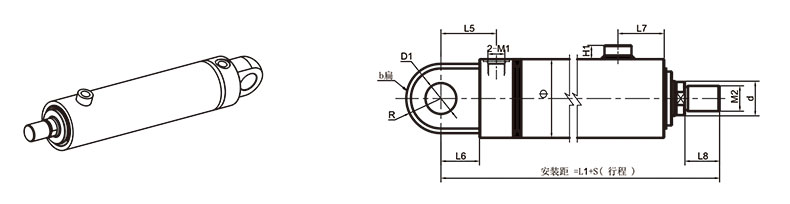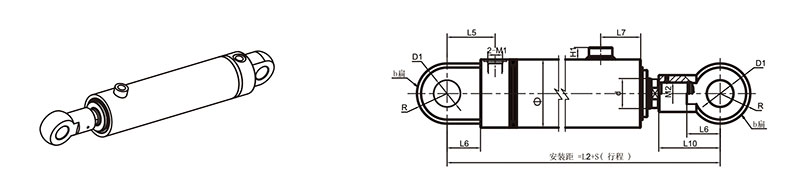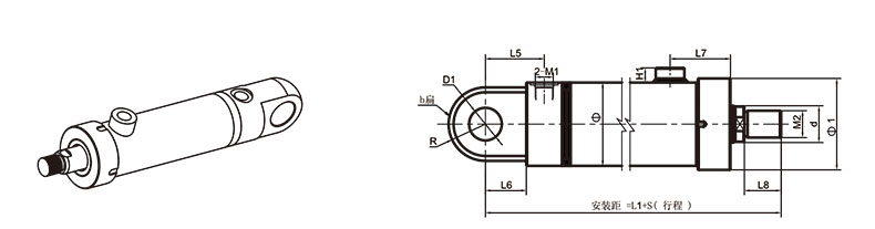 活塞桿端為外螺紋桿頭耳環(huán)連接
