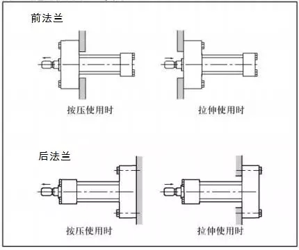 ?。?)法蘭安裝適合于液壓缸工作過程中固定式安裝,其作用力與支承中心處于同一軸線的工況;其安裝方式選擇位置有端部、中部或尾部三種,如何選擇取決作用于負(fù)載的主要作用力對活塞桿造成壓縮(推)應(yīng)力、還是拉伸(拉)應(yīng)力,一般壓縮(推)應(yīng)力采用尾部、中部法蘭安裝,拉伸(拉)應(yīng)力采用端部、中部法蘭安裝,確定采用端部、中部或尾部法蘭安裝需同時結(jié)合系統(tǒng)總體結(jié)構(gòu)設(shè)計要求和長行程壓縮(推)力工況的液壓缸彎曲穩(wěn)定性確定。