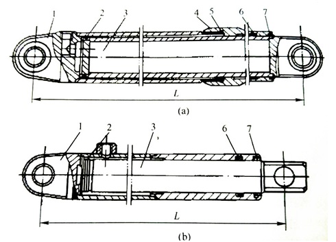 圖示 ZG1型柱塞缸 (a) 導(dǎo)向套與缸筒螺紋連接(b)導(dǎo)向套與缸筒焊接