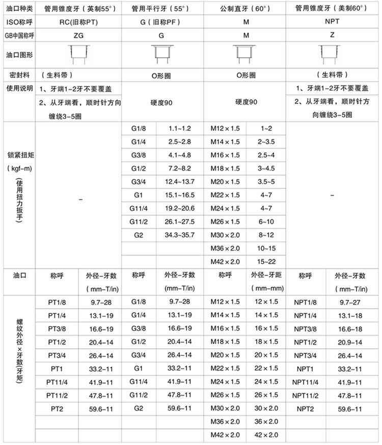 液壓油缸的油口種類、油口尺寸對照表如下,供您參考: